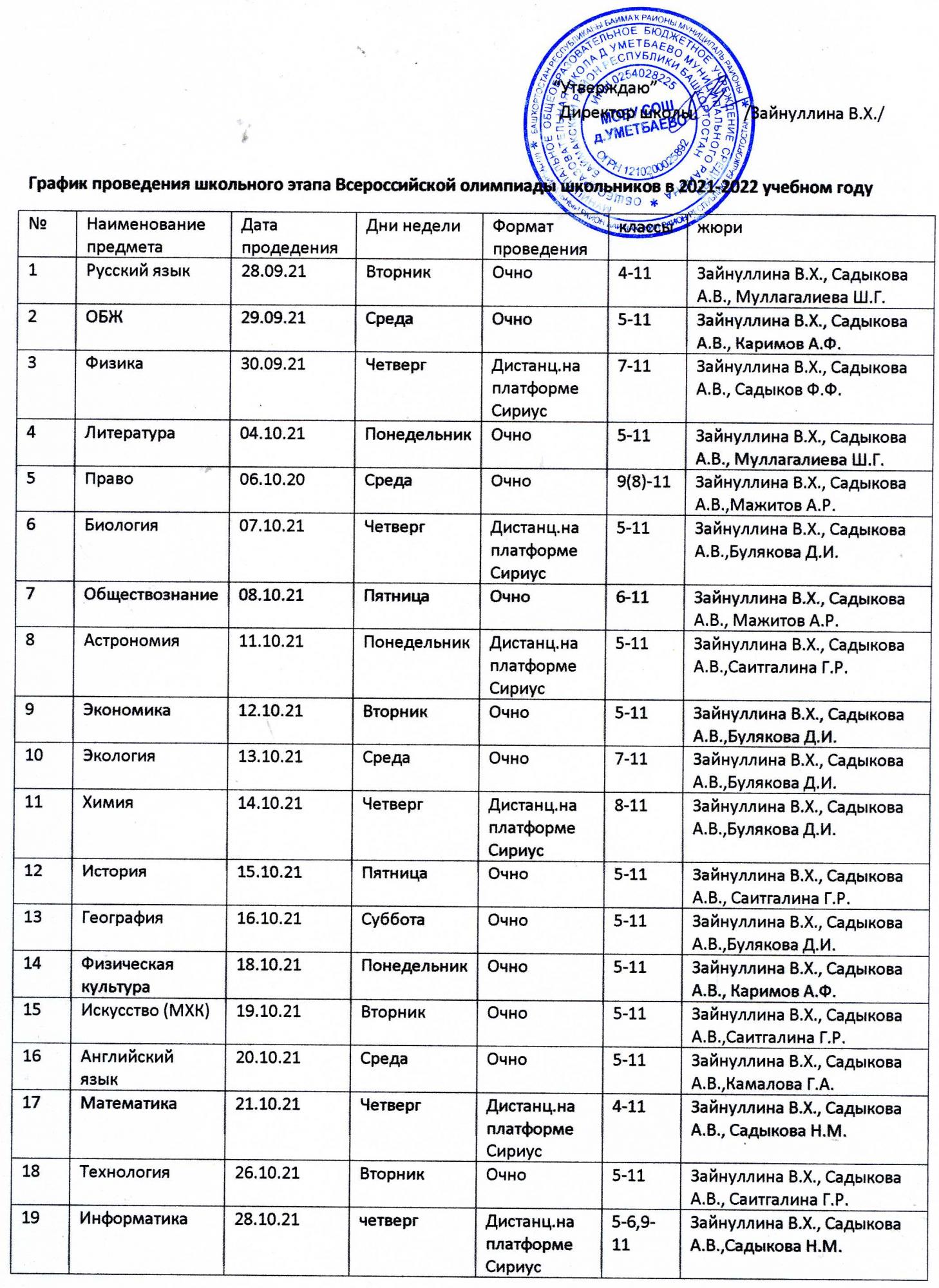 График проведения школьного этапа Всероссийской олимпиады школьников